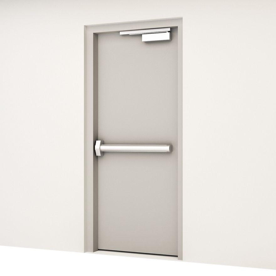 ASSA ABLOY Opening Solutions Middle East doorset for a fire rated escape route single leaf steel door. Equipped with fire rated panic exit device and door closer with Cam-MotionĀ® technology.