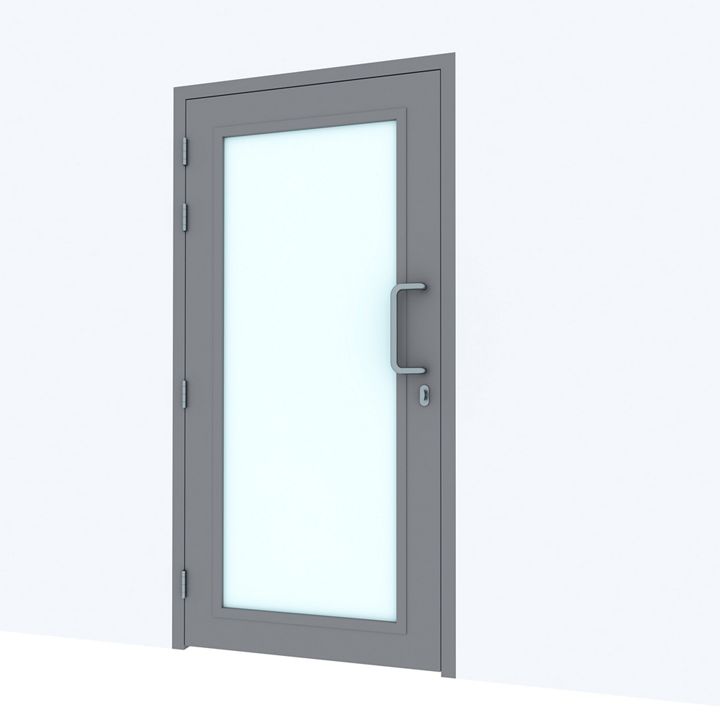 ASSA ABLOY Opening Solutions Middle East doorset for an Office Entrance with Non-fire rated single leaf steel frame Full glass door. Equipped with, mortice narrow stile roller latch lock, Pull handle and master keyed cylinder and Concealed door closer.