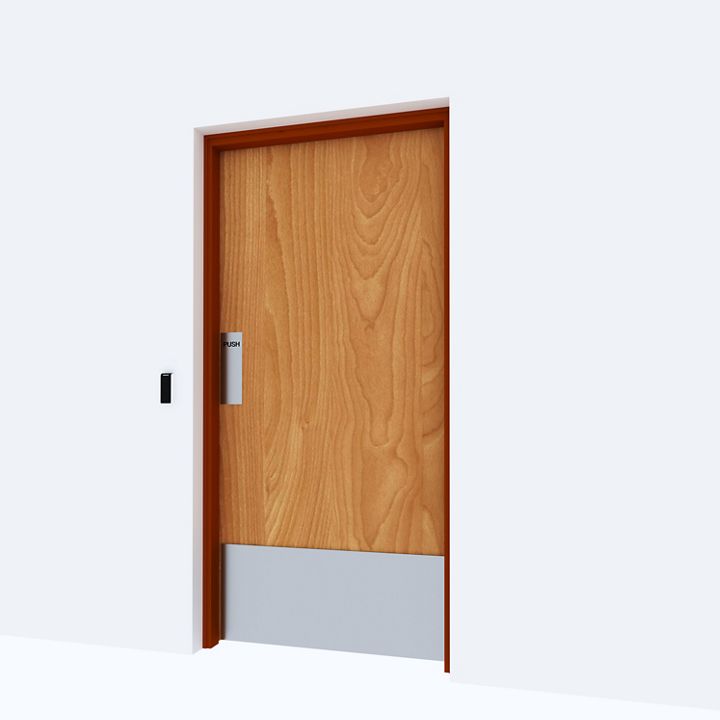 ASSA ABLOY Security Solution Middle East Fire Rated Single Leaf doorset for Doorset Automatic. Equipped with Swing door operator with Card reader, microwave switch, break Glass Unit, Pull handle, protection plate, Bolt switch contact