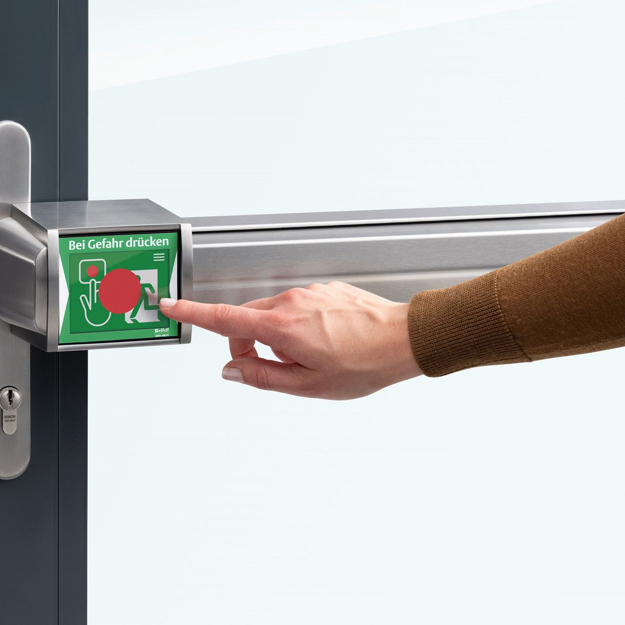 Die innovative Panik-Druckstange beinhaltet die komplette elektrische Fluchttüranlage in einem Element.