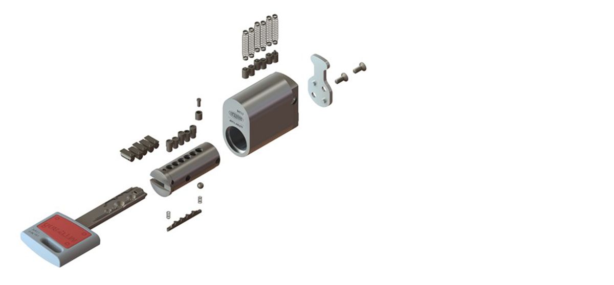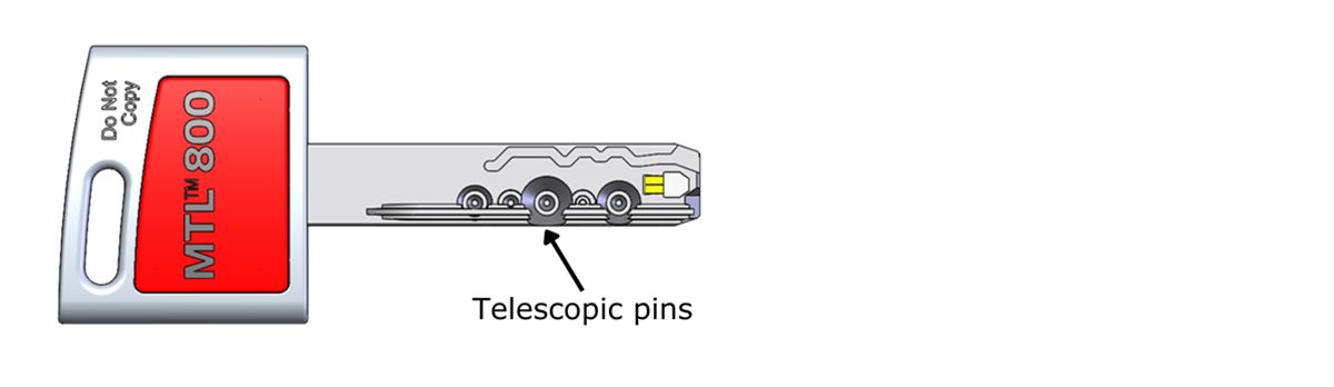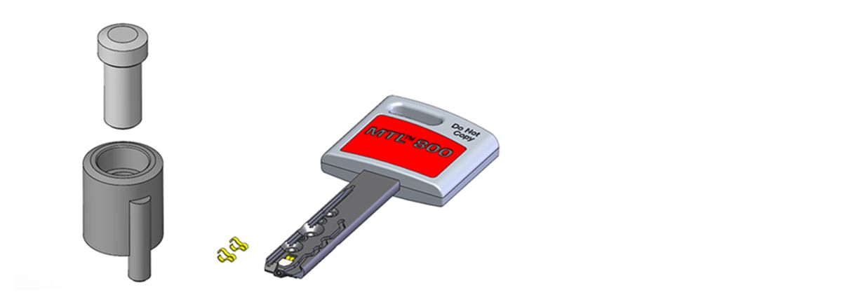 The locking bar mechanism is the third technology featured in the MTL™800 cylinder. Correct alignment of the locking bar pins depends upon the correct combination key being inserted into the cylinder. The milled pattern which runs along the length of the key interacts with the top bar horizontal pins, creating the required shear line.