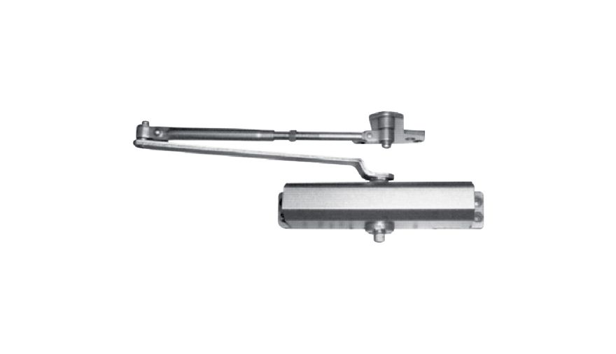 Closer mounted on door. Bracket on frame soffit.