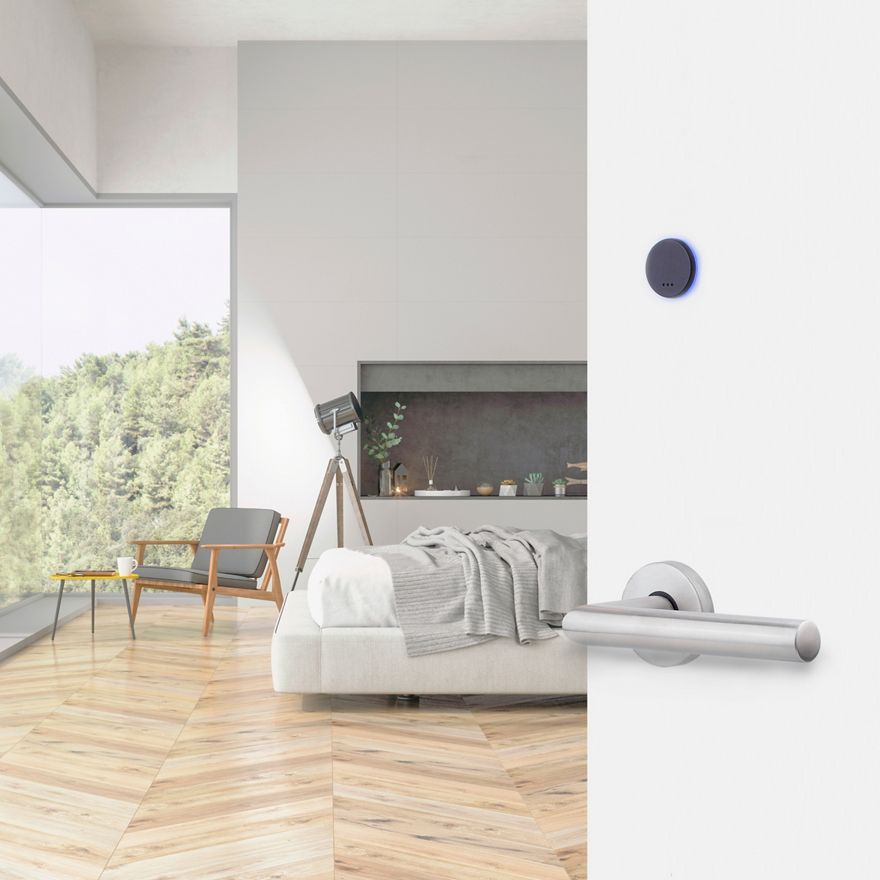 Zámek i-minimal Lock elegantně skrývá vše v dveřním křídle, s viditelným čtecím modulem na vnější straně a tlačítkem soukromí na vnitřní straně. Instalace nevyžaduje žádné vrtání ani kabeláž.