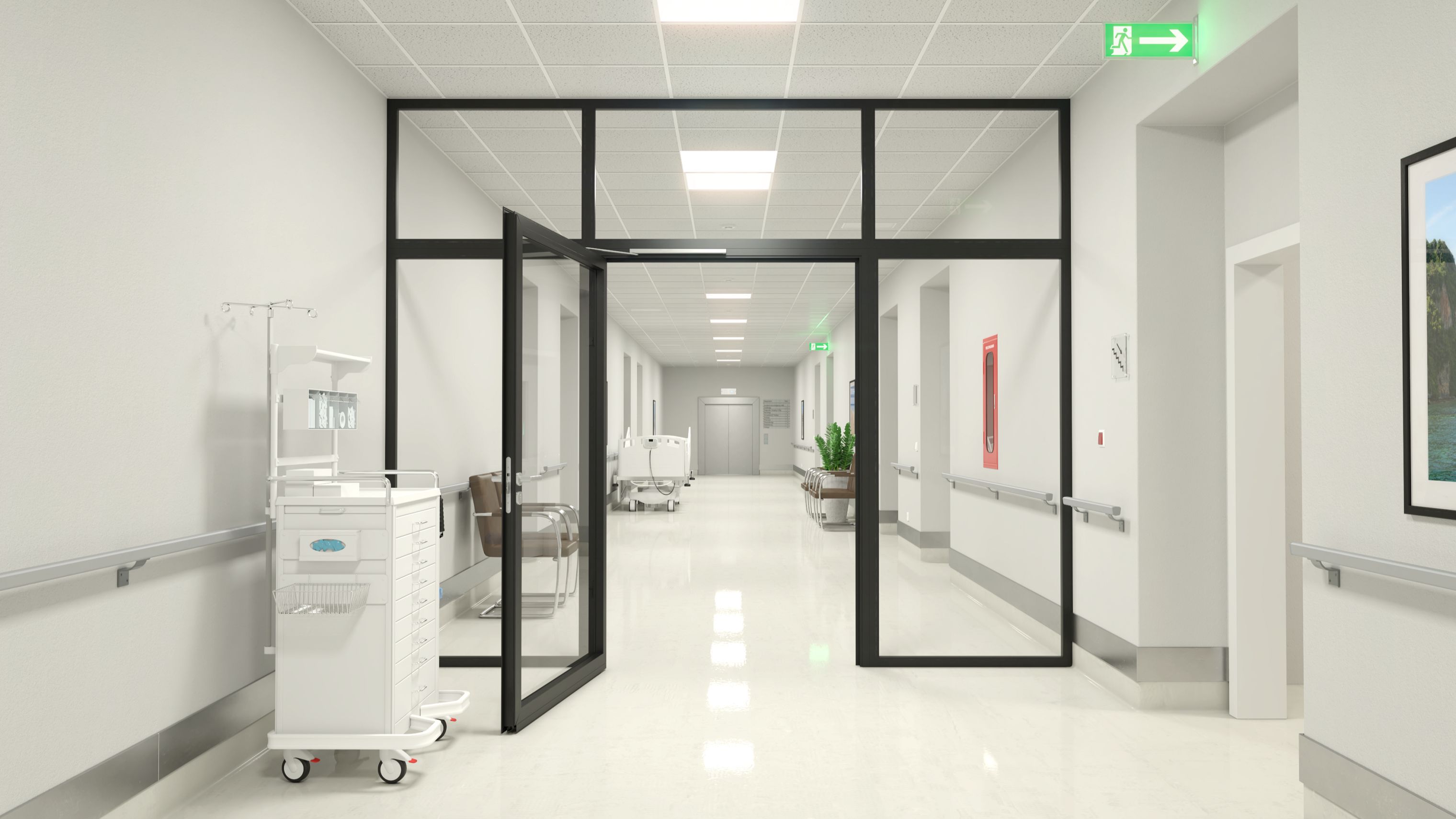 - Zutrittskontrolle: sichere sowie barrierefreie Zugänge für Patienten, Besucher und Personal