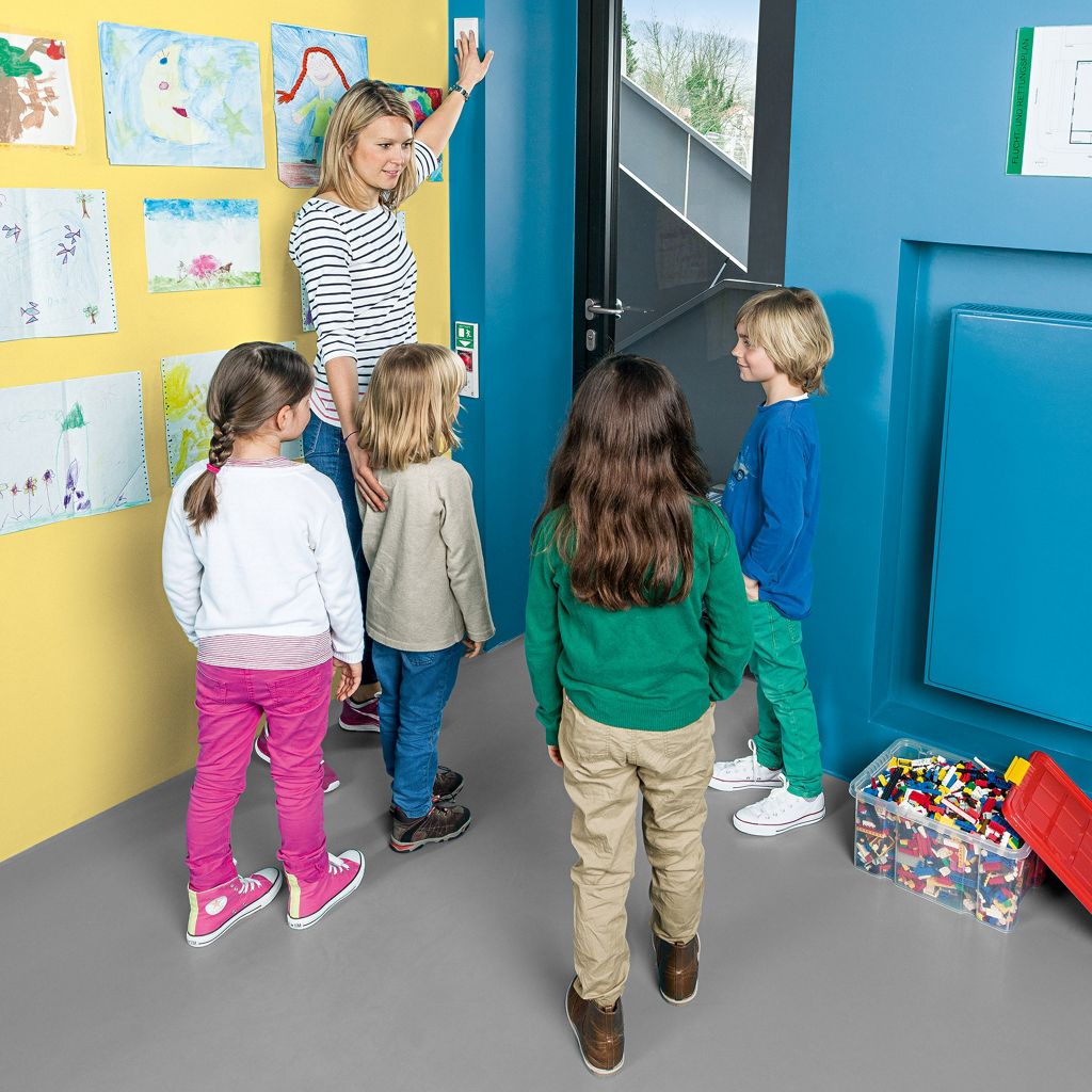 A door terminal with an emergency button is installed at a height of approx. 1.05 meters so that children can leave the building in emergency case without help from an adult. When a child presses this red button, they can open the door. At the same time, an alarm is triggered so that no child can get outside unnoticed.