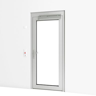 With the escape door look especially for nursery schools the door is closed and locked in the basic state. A switch is mounted on the outside that is only activated during certain periods. A door terminal with an emergency button is fitted so that children can get out without adult help in an emergency.