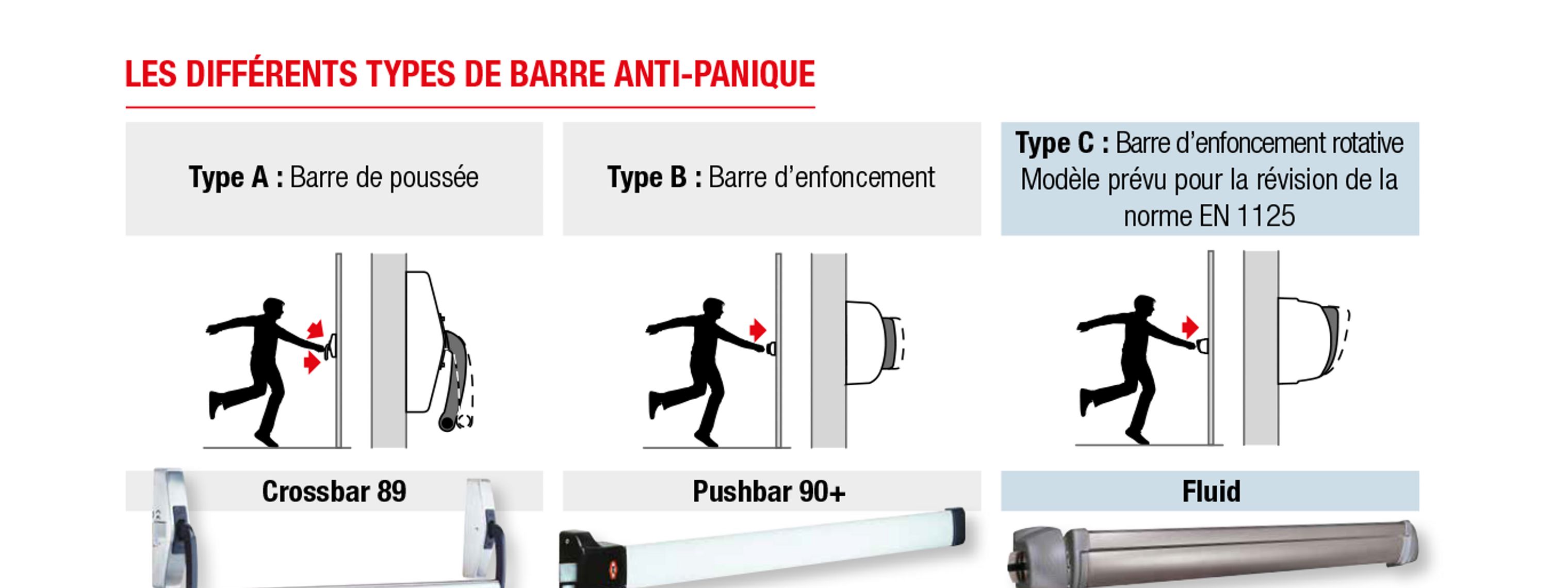 Une barre antipanique prend à peu près 90 % de la porte et cela rend possible de manœuvrer avec le corps. La barre devient même accessible dans le noir ou dans la fumée.