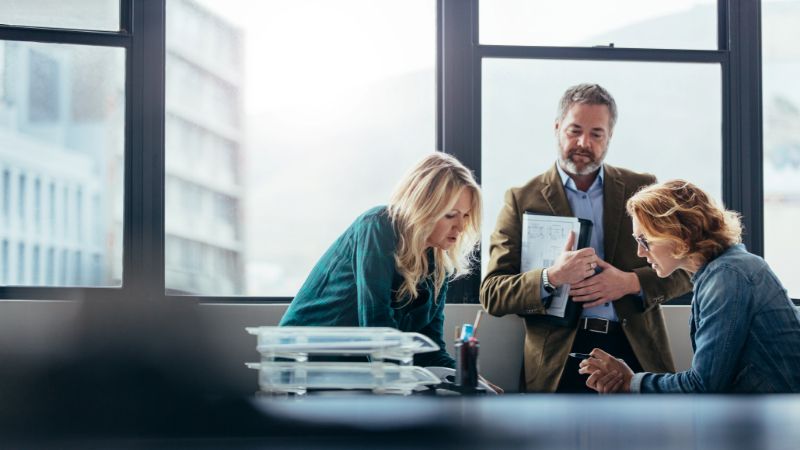 • Two specification writers by computer screen.