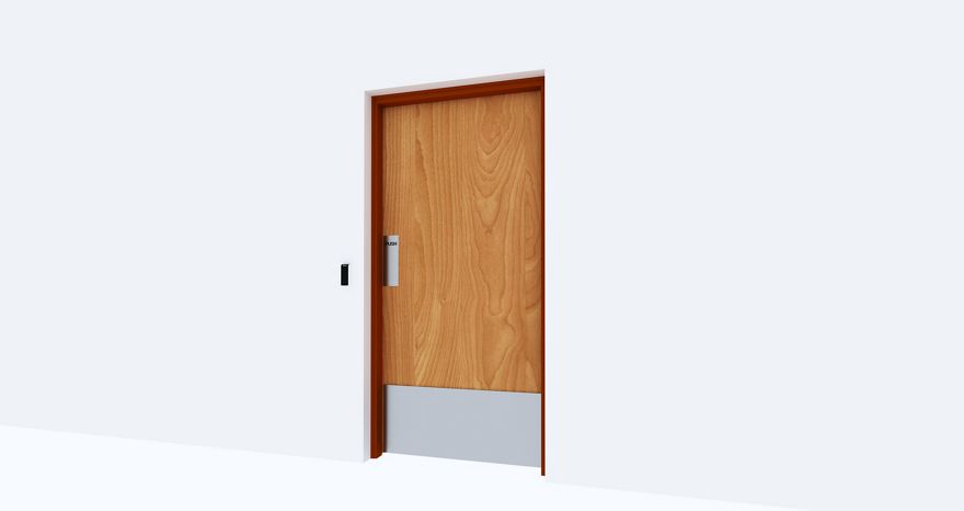 ASSA ABLOY Security Solution Middle East Fire Rated Single Leaf doorset for Doorset Automatic. Equipped with Swing door operator with Card reader, microwave switch, break Glass Unit, Pull handle, protection plate, Bolt switch contact