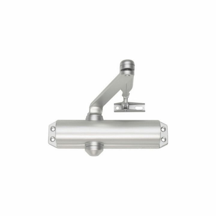ASSA ABLOY DC 120 surface mounted door closer on single action door, silver finish