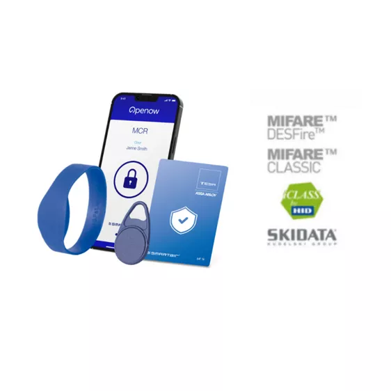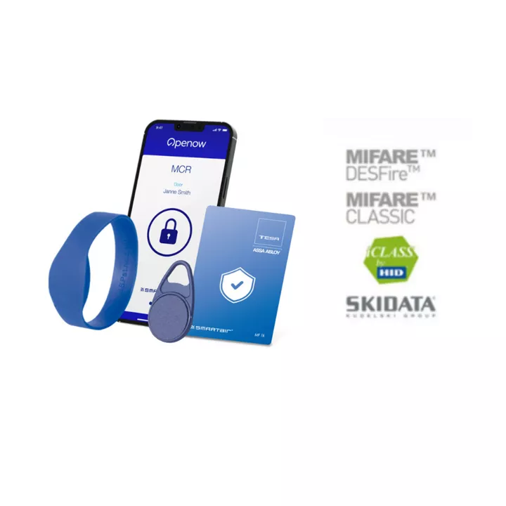 TESA Hotel credentials are more flexible and cost-efficient than mechanical keys. Encrypted TESA Hotel credentials are available for all standard secure RFID technologies — HID iCLASS®, MIFARE® Classic or DESFire® and SKIDATA. Multiple credential types are supported, including cards, tags, bracelets and stickers. This allows you to give your guests the type of credential that is the most convenient for the both of you.