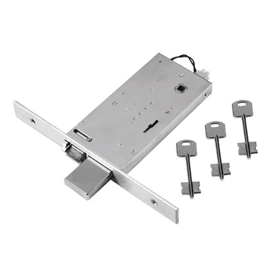 The F69 electrical mortise locks for mid-rail doors have a single central locking point and a double bitted mechanism, with a 4-way deadbolt.
