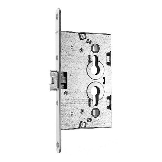 It is a reversible model that can be used on both right-hand and left-hand doors. It features a single-way latch bolt and is designed for the insertion of a Euro-profile cylinder.