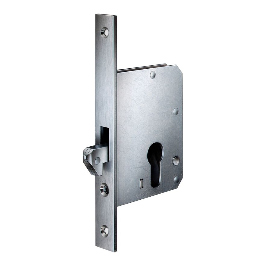 Questa serratura a gancio per porte scorrevoli con foro per cilindro a profilo europeo è compatibile con l'incontro elettrico 222.