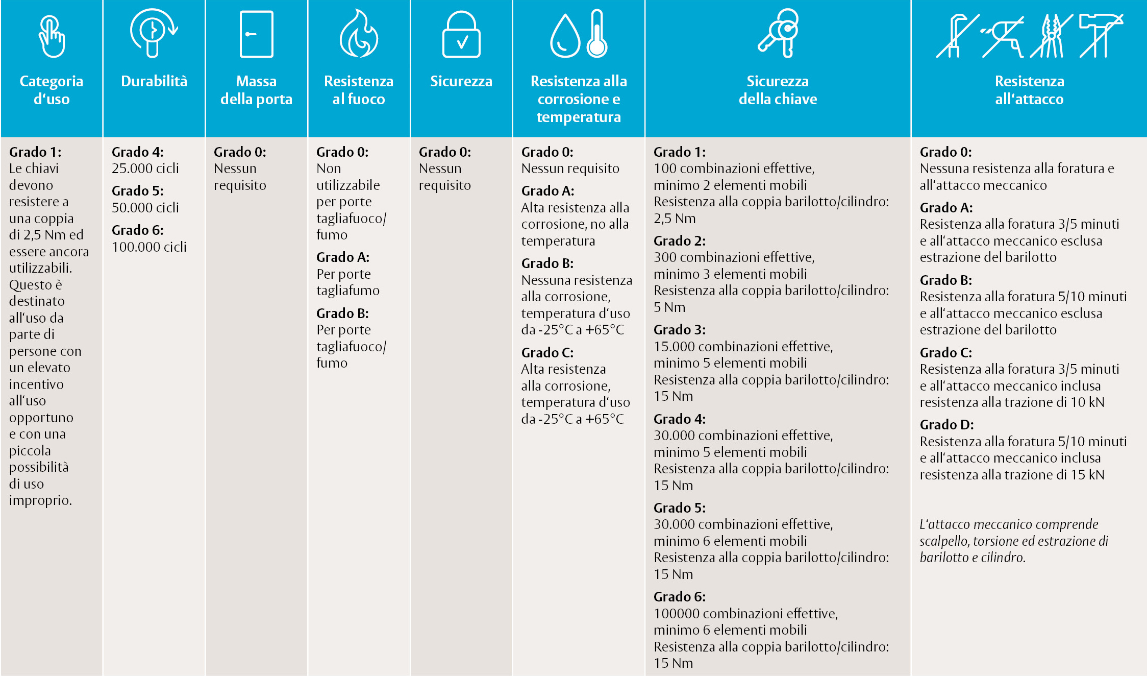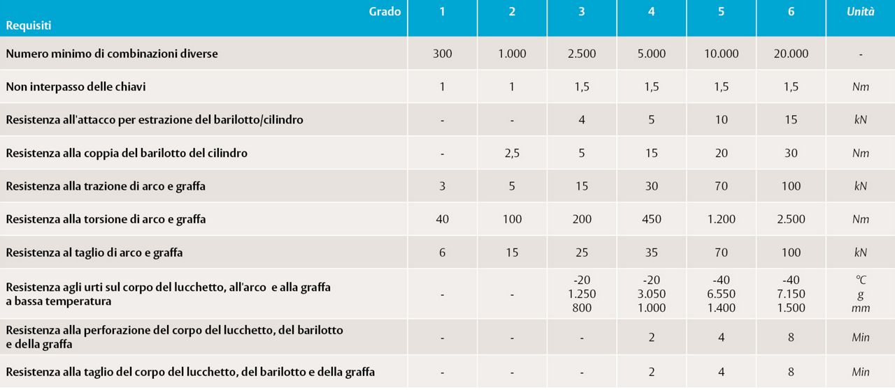 La norma EN 12320 stabilisce sei gradi - dal grado 1 (bassa sicurezza) al grado 6 (massima, solo per casi specifici) - basati su test di prestazione per la resistenza alla corrosione, la durata, la sicurezza della chiave e la resistenza a varie forme di attacco. Per ottenere un grado, tutti i criteri devono essere raggiunti o superati.