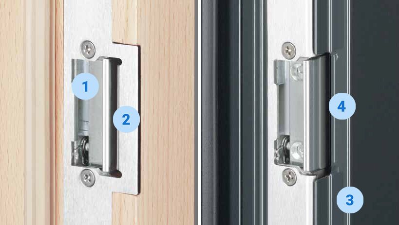 - Nelle porte in metallo la guarnizione della porta rimane intatta (ciò consente un migliore isolamento termico e acustico) (3) e non è necessario realizzare un ulteriore scasso all'interno del telaio della porta per alloggiare il ricevi scrocco (4).