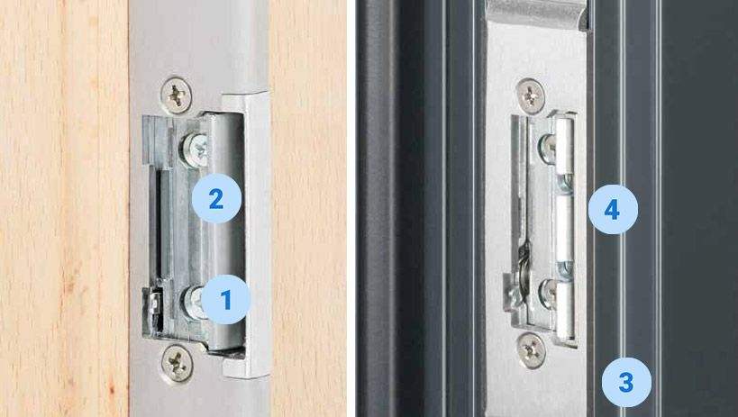 - Nelle porte in metallo la guarnizione viene interrotta per permettere l'installazione dell'incontro elettrico (3). Questo comporta perdita di isolamento acustico e termico della porta stessa. Inoltre deve essere effettuato uno scasso aggiuntivo a vista per permettere l'alloggiamento del riceviscrocco (4).