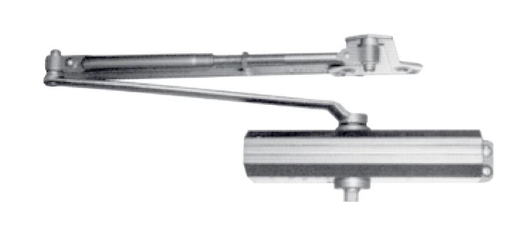 Closer mounted on door. Bracket on frame soffit.