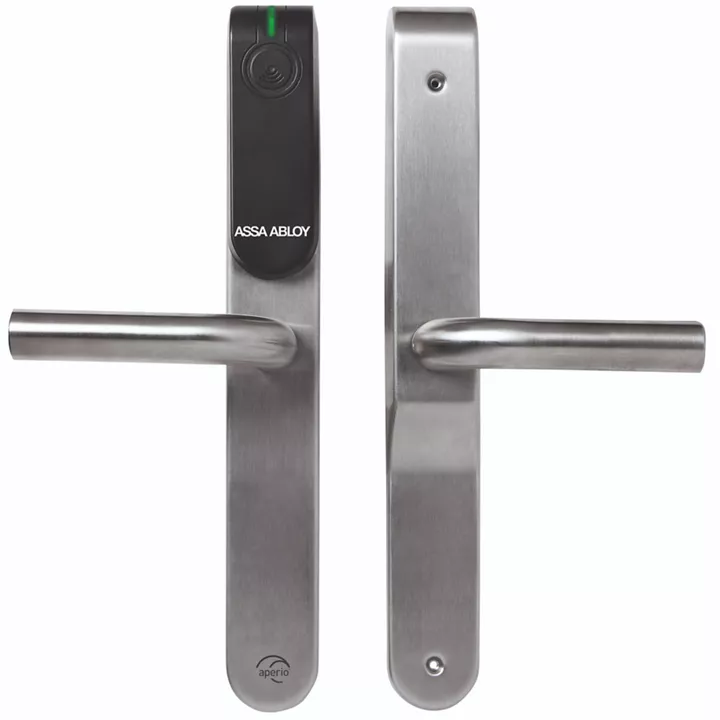 Secure your interior doors cable-free with certified DIN/EN escutcheons. Aperio escutcheons have integrated RFID and BLE readers. Versions with and without PINpad, as well as with and without privacy function, are available