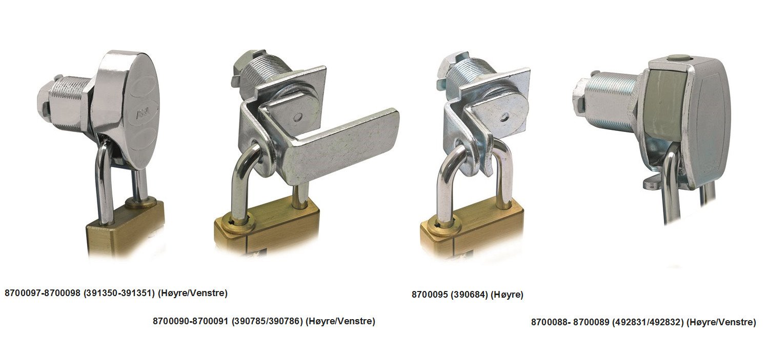 I låst posisjon forhindrer hengelåsen dreiing av reile. Når hengelåsen er fjernet kan beslaget dreies og skapet åpnes. Alle beslag produseres i høyre og venstre utførelse.