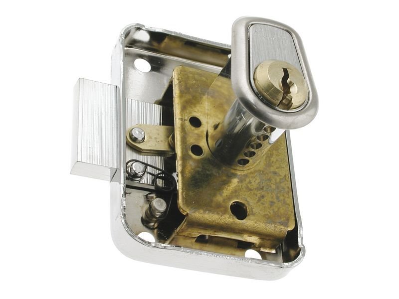 Møbellås med reile. Nøkkelen kan tas ut i åpen el. låst stilling.