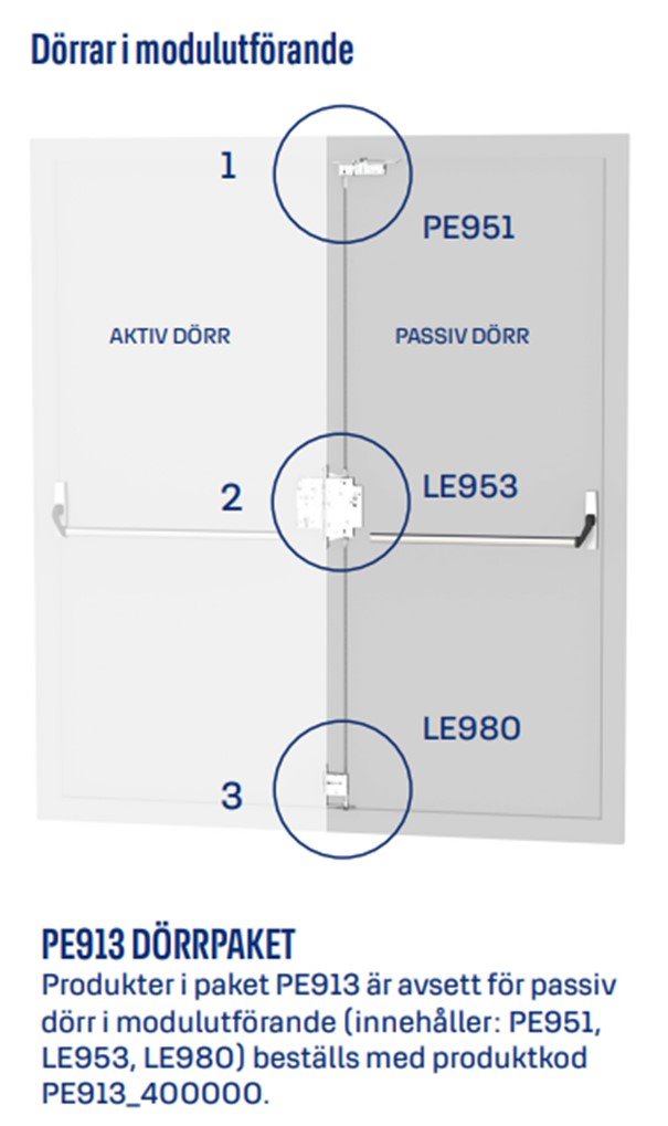 PE903 er et innfelt panikkbeslag for passiv smalprofildør. PE903 varenummer er en komplett pakke inkl. panikkbeslaget for den passive døren. Her må man kun velge bredde på sluttstykke stolpen og lengde på bolt i gulv. Motorlås EL495 og EL495FU benyttes i aktiv dør med eller uten panikkbeslag PBE003. Med innfelt beslag skades ingen deler og utstyret holder i mange år.