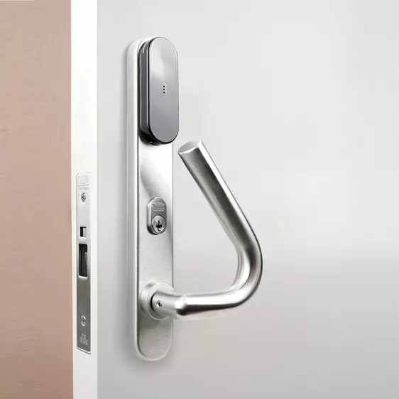 The SMARTair wire-free and battery powered Wireless escutcheons are ideal for high traffic doors. The wide range of escutcheons offer a RFID reader and locking mechanism in one for all kind of doors. - ASSA ABLOY