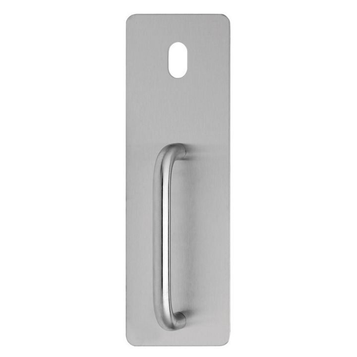 The 214 Series Door Furniture is 300 x 100 x 2mm thick stainless steel or brass plates with 10mm radius corners. Concealed fixed plates have studs with internal threads located in each corner, visible plates have corresponding countersunk holes and are fixed back to back through the door.