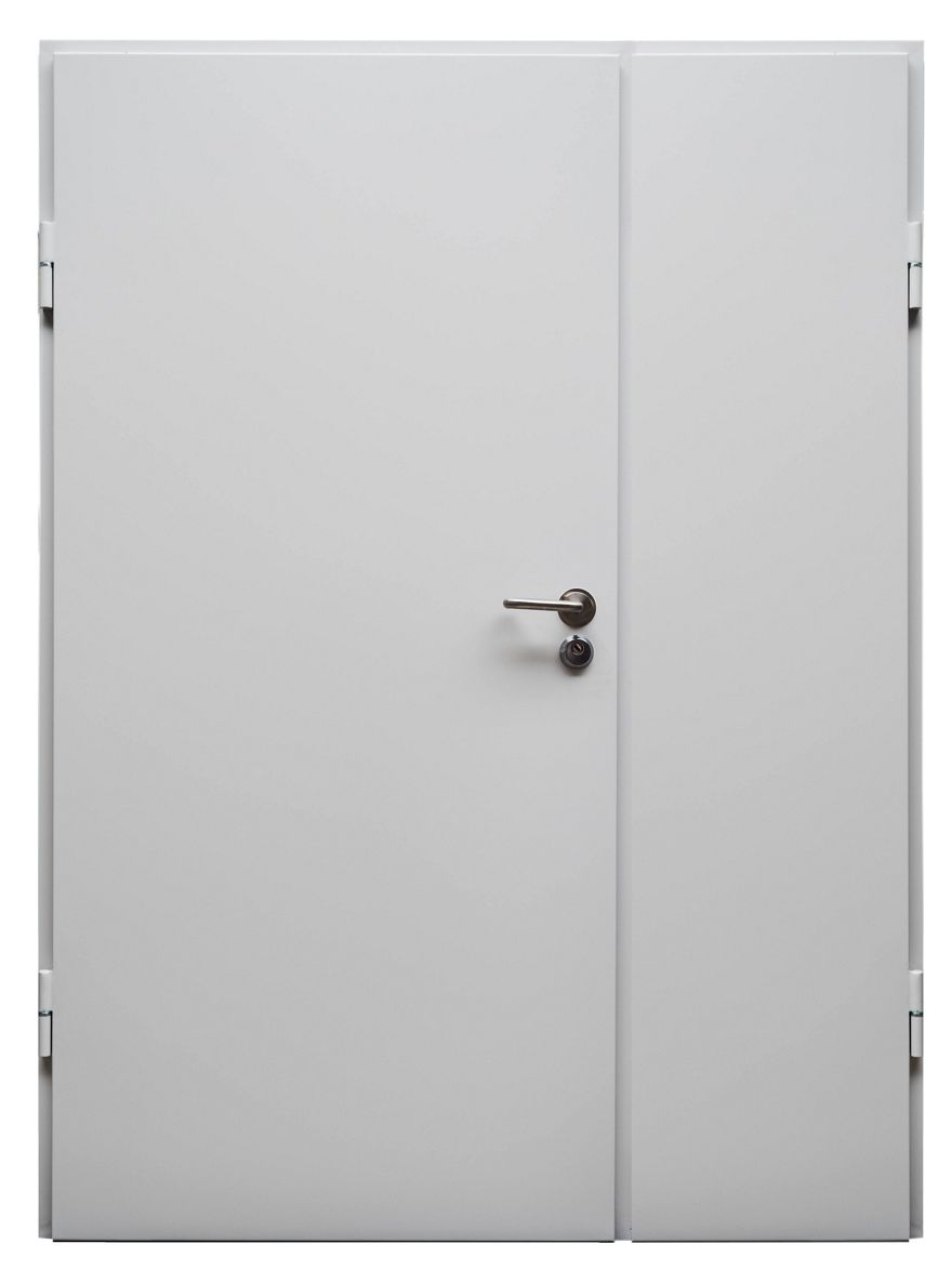 The DL1.1 doors are manufactured in various sizes. They are steel doors with profiled rebates on four edges. The door leaves with a thickness of 50 mm are composed of two zinc plated steel sheets 1 mm thick. The construction is reinforced internally by „L” profiles. The space between profiles is filled with mineral wool. „C” or „L” profile frame is made of zinc plated steel sheet 2 mm thick. On the perimeter of the door leaves, there are EPDM rebate gaskets. EPDM gaskets are also installed along the perimeter of the frame, except for the threshold. The door can be equipped with a threshold of 20 mm high or a drop down seal. The door leaves are equipped with two hinges ø20 with ball bearings on each leaf, main lock minimum class 3, stainless steel handle, two manual flush bolts on secondary and two anti-burglary bolts on each leaf. The DL1.1 door can be used as external and internal door, opened outwards or inwards.