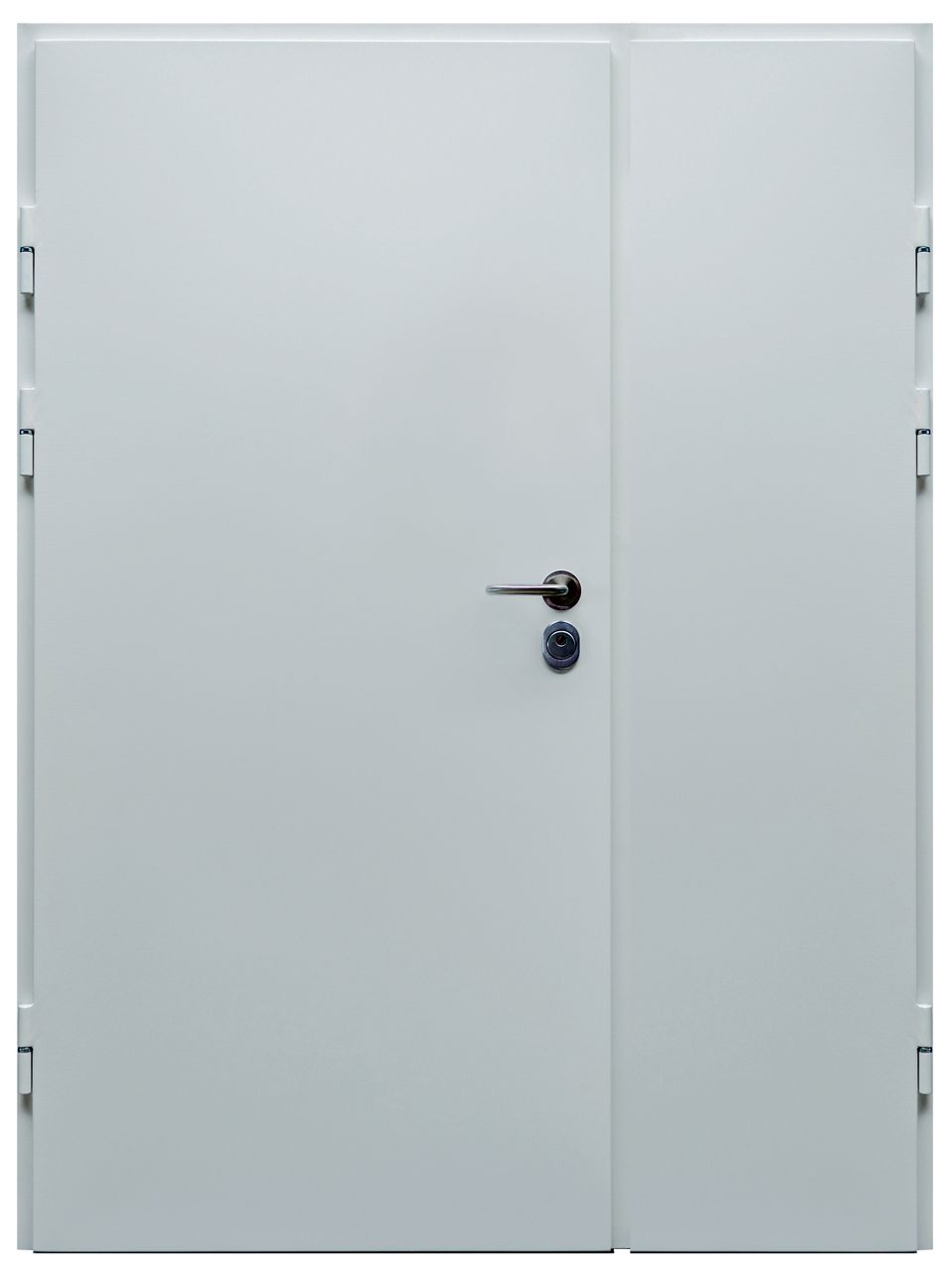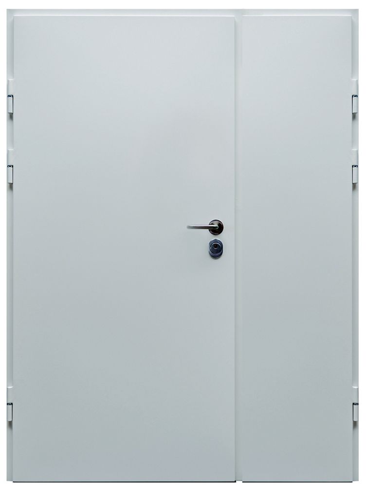 The DL1.3/2 DRAGON doors are manufactured in various sizes. They are steel doors with profiled rebates on four edges. The door leaves with a thickness of 60 mm are composed of two zinc plated steel sheets 1 mm thick. The construction is reinforced internally by „L” profiles. The space between profiles is filled with mineral wool. The door leaf is equipped with three hinges ø22 with ball bearings on each leaf. „C” or „L” profile frame is made of zinc plated steel sheet 2 mm thick. On the perimeter of the door leaf, there are EPDM rebate gaskets. EPDM gaskets are also installed along the perimeter of the frame, except for the threshold. At standard, the door frame is equipped with a threshold of 20 mm high. The hinge side is secured by three anti-burglary bolts on each leaf.