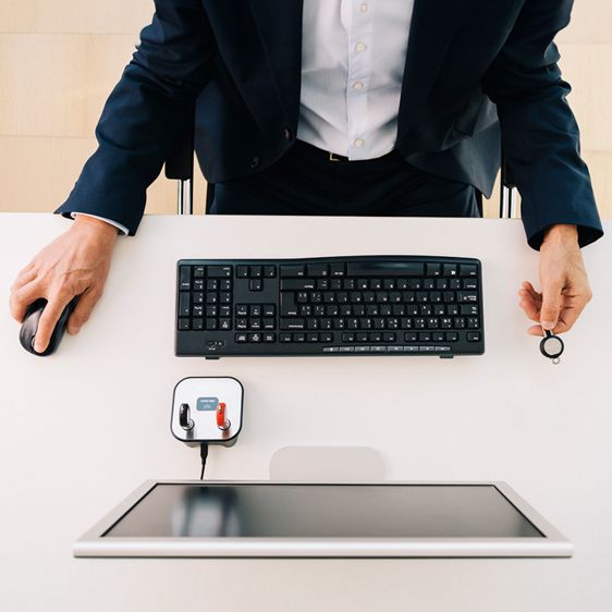 Programator biurkowy CLIQ pomaga zarządzać prawami dostępu do kluczy z komputera. Podłączony do komputera pozwala na zapisywanie na kluczach struktury dostępowej oraz na przenoszenie informacji z zamknięć do systemu. Lewy port programatora służy do obsługi kluczy administratora/administratorów (C-Key), a prawy do obsługi kluczy użytkowników (N109 E3/N110 E3).