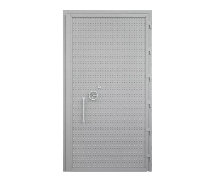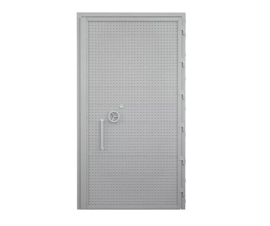 Jednoskrzydłowe, stalowe, płaszczowe o odporności na włamanie klasy RC6. Skrzydła całostalowe z blach ocynkowanych z wypełnieniem wełną mineralną zawieszone na sześciu łożyskowanych zawiasach. Ryglowane na wszystkich czterech krawędziach. Obustronnie zabezpieczone pancerzem przeciwwybuchowym. Ościeżnica z profilu ceowego z felcem poduszczelkowym i progiem. Wymiary maksymalne w świetle przejścia 1420 x 3000 mm.