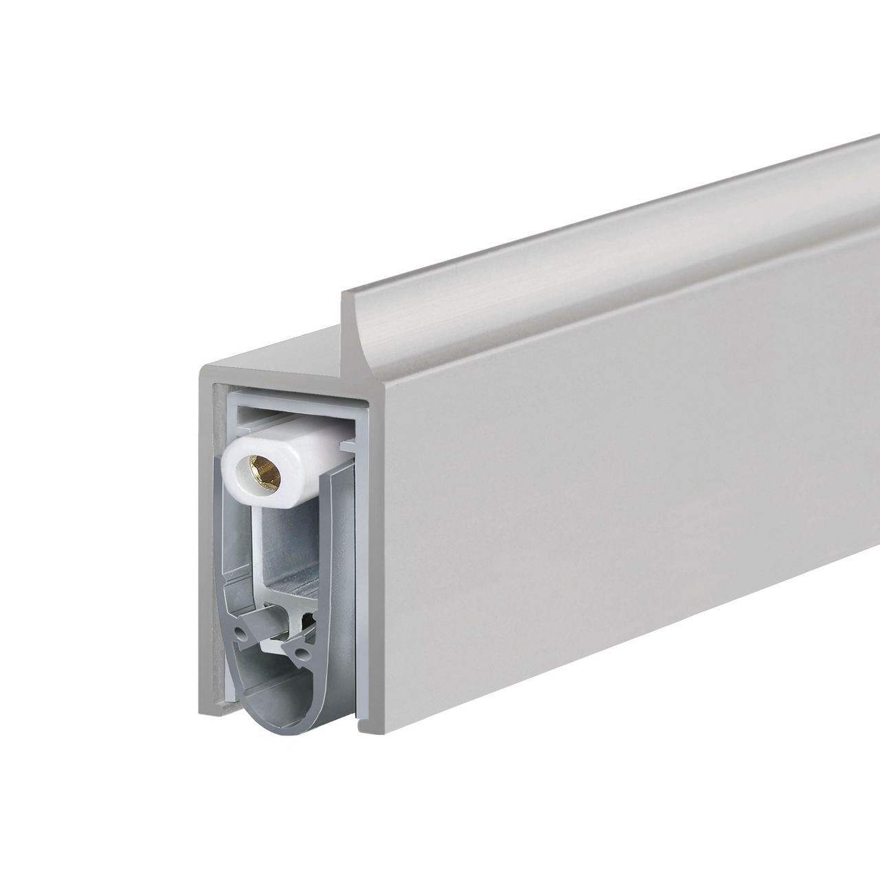 Uszczelka automatyczna do drzwi opuszczanych Planet KG-D10 RD | 48 dB, jednostronne odblokowanie z równoległym opuszczaniem i automatyczną kompensacją dla pochyłych podłóg, profil ochronny z anodowanej na srebrno stali EV1 lub anodowanej na satynowo stali nierdzewnej, klej UV od spodu na szklanych drzwiach, wysokość opadania uszczelki do 18 mm. Silikonowa uszczelka. Profil ochronny i profil z aluminium 16,5 x 35 mm, wraz z pokrywą po stronie zamka do drzwi skrzydłowych.