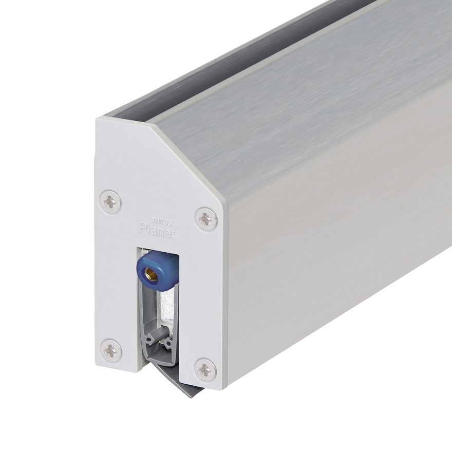 Automatyczna uszczelka opadająca Planet KG-MinE-S10 | 27 dB do drzwi dźwiękoszczelnych ze szkła z przepuszczalnością powietrza, do podłóg prostych i nierównych, odblokowanie po stronie zawiasów z automatyczną kompensacją dla podłóg pochyłych. Równoległe opuszczanie, wysokość opadania do 27 mm, uszczelka silikonowa, kanał KG-MinE-S10 w kolorze srebrnym anodowanym EV1 lub matowym anodowanym ze stali nierdzewnej, do mocowania i klejenia, profile wykonane z aluminium 13 x 30 mm / 34 x 61 mm, kanał KG-MinE-S10 i uszczelka podłogowa wyposażone w materiały izolacji akustycznej.