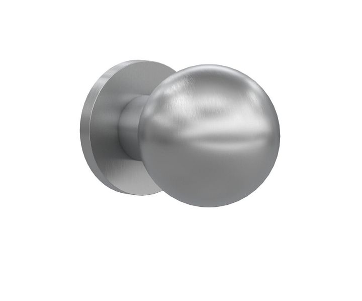 Gałka kulista stała na okrągłej rozecie. Wykonana ze szczotkowanej stali nierdzewnej.