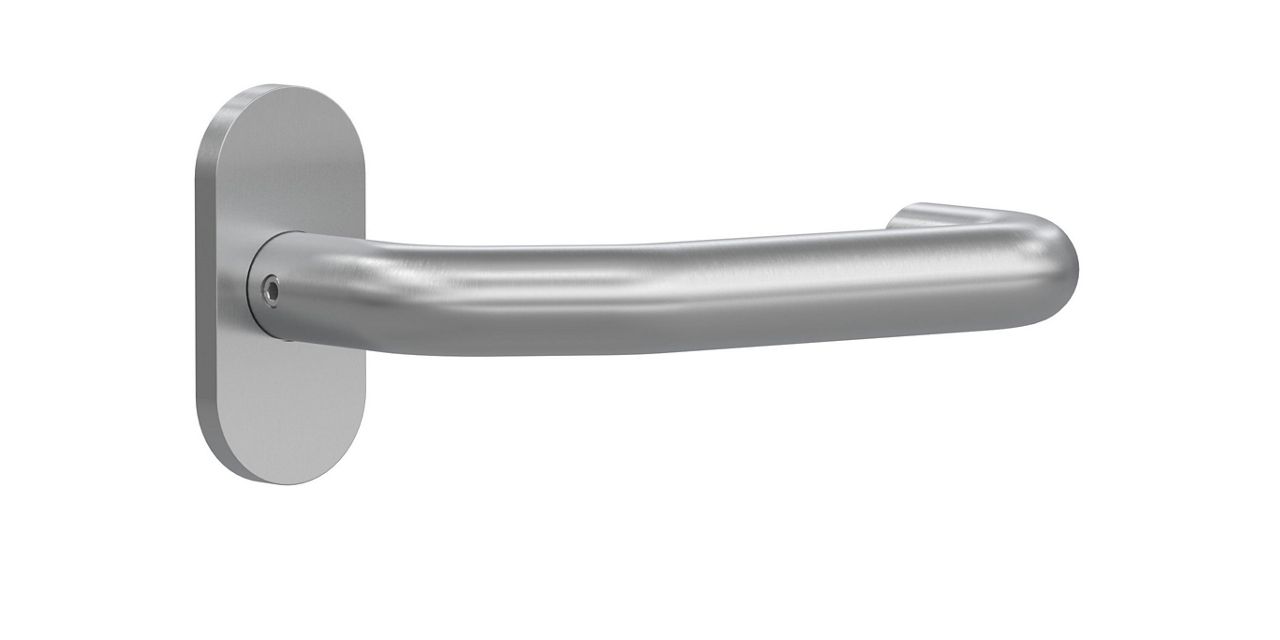 Klamka U-form odgięta na owalnej rozecie. Wykonana ze szczotkowanej stali nierdzewnej.