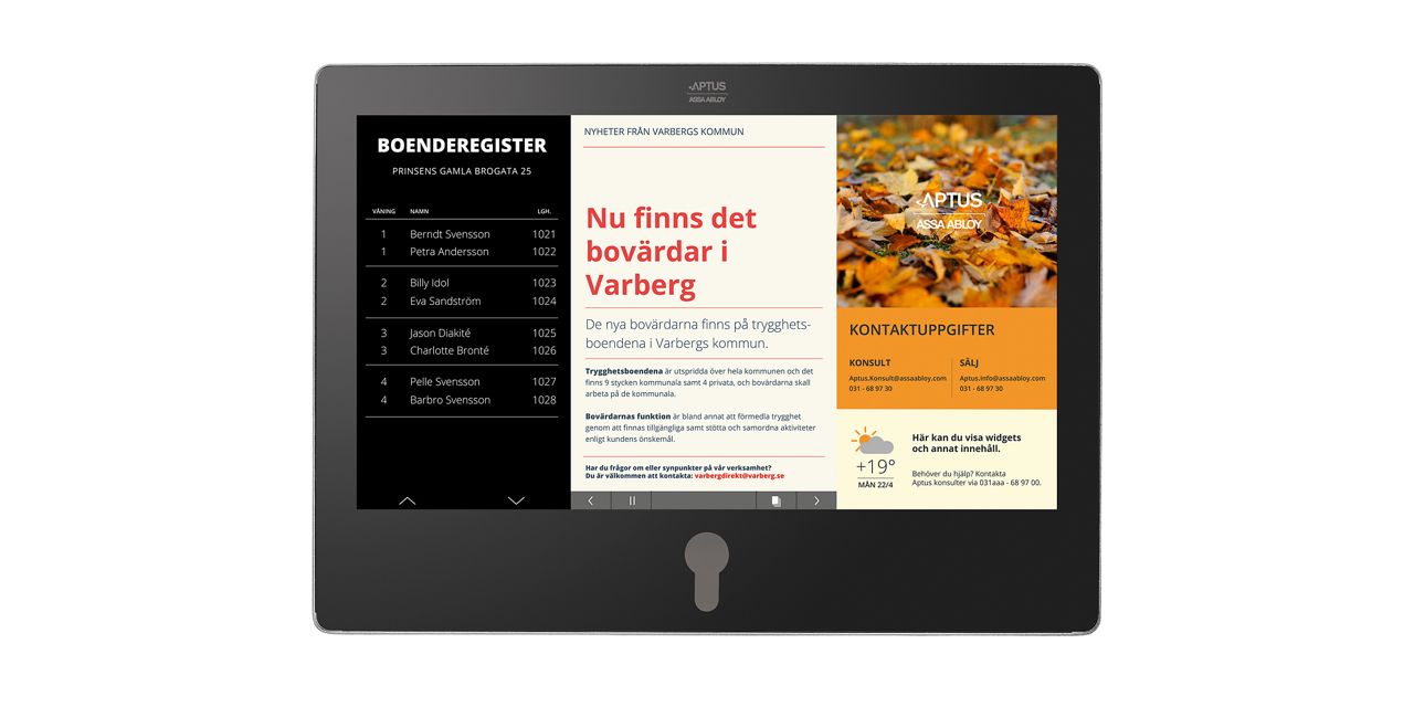 The Aptus Agera 22 communication board where tenants can make bookings, request services and check energy consumption via a touchscreen. Time tables and weather can also be displayed.Aptuskabel 1 CPR