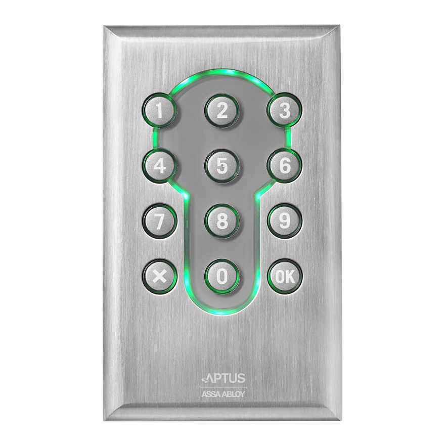 A small, practical reader with illuminated keypad and keyhole symbol. Öppna 1500 is surface mounted for indoor and outdoor use.