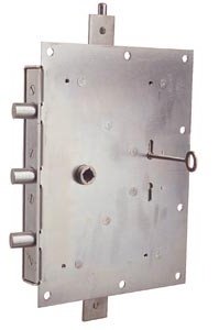2960 är ett tillhållarlås med 8 tillhållare avsett för utanpåliggande montage i kraftiga portar och dörrar.