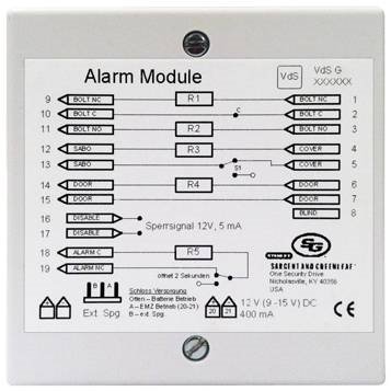 - Aktivering/Deaktivering av S&G elektroniska kombinationslås via extern strömkälla som larmsystem, kortläsare mm. Med 12VDC spänning till larmboxen är låset deaktiverat och går ej att öppna.