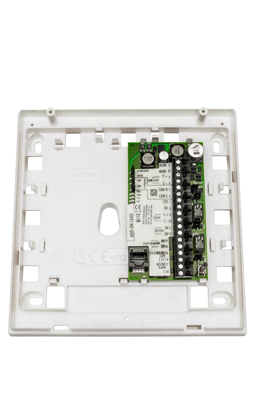 Kommunicerar med HiO enheter såväl som traditionella CL20-enheter. 2 ingångar för öppnknapp och dörrövervakning. 2 utgångar för momentan larmförbikoppling och ellåsstyrning.