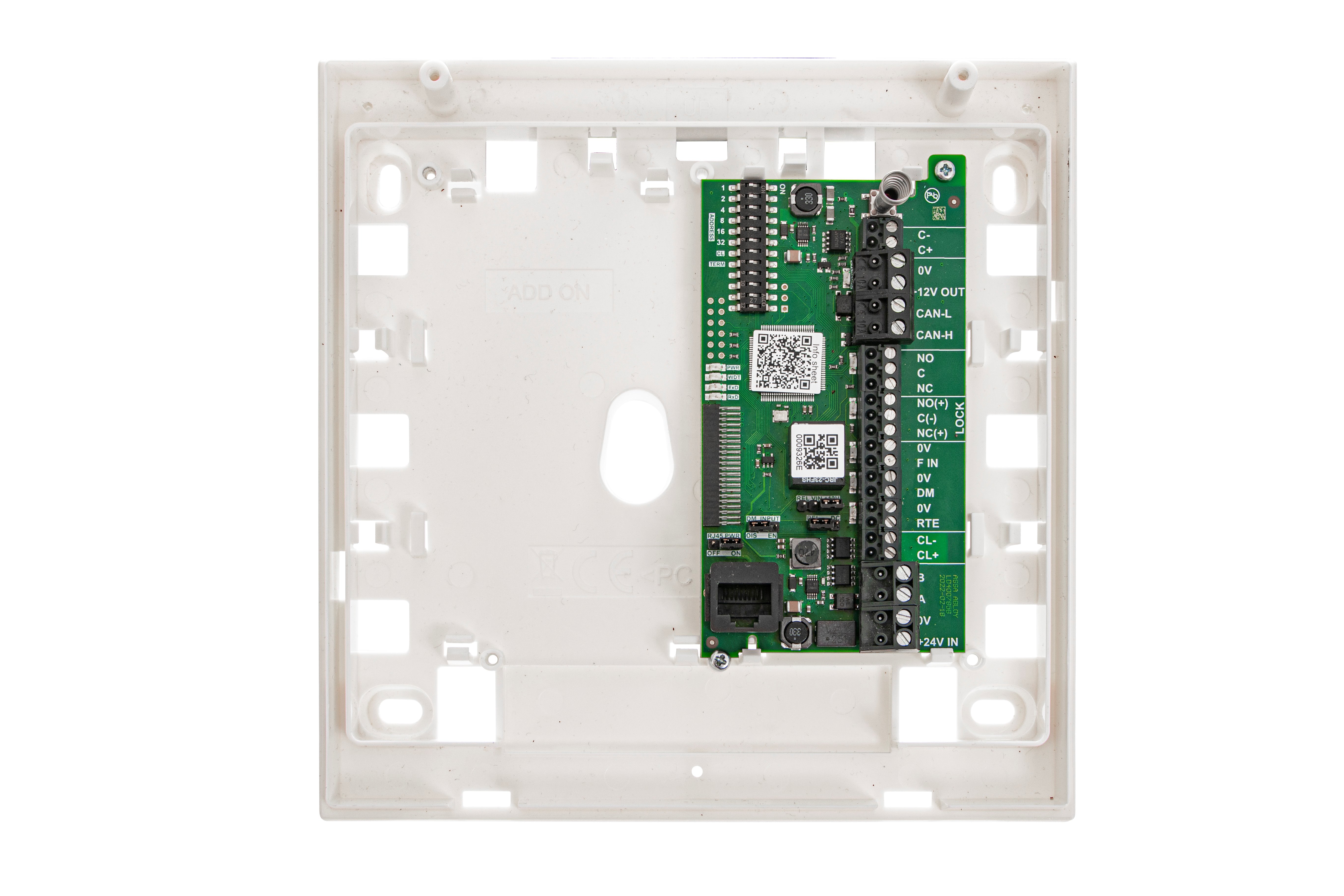 Kommunicerar med HiO enheter såväl som traditionella CL20-enheter. 2 ingångar för öppnknapp och dörrövervakning. 2 utgångar för momentan larmförbikoppling och ellåsstyrning.