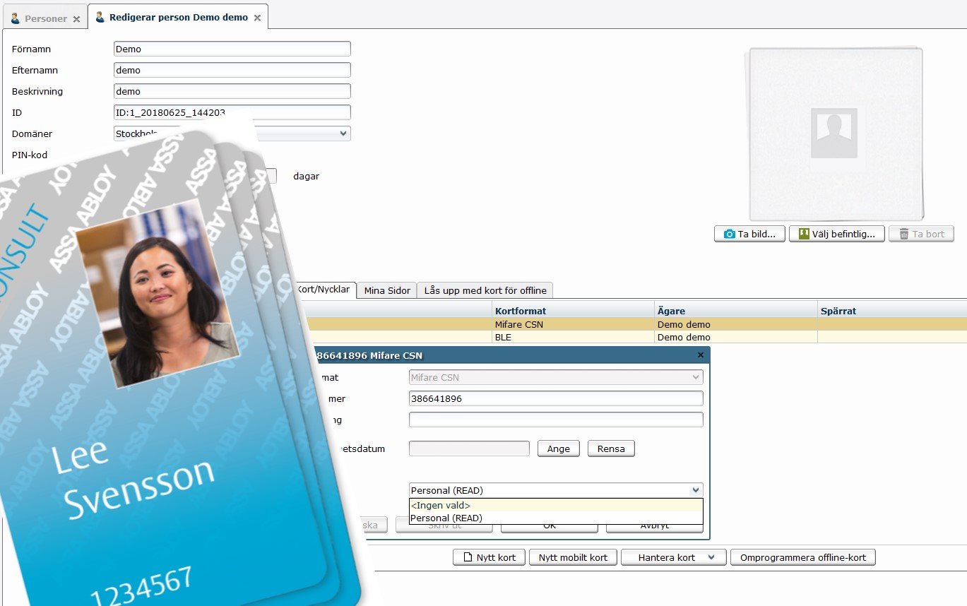 Persondata hämtas från ARX databas och kan presenteras valfritt i kortlayout. Använd redan lokalt sparad foto eller tag bild med ansluten kamera. Kort skrivs ut på ansluten kortskrivare, allt i från ARX klentens användargränssnitt. Utläsning av kortnummer kan göras i samband med utskrift.