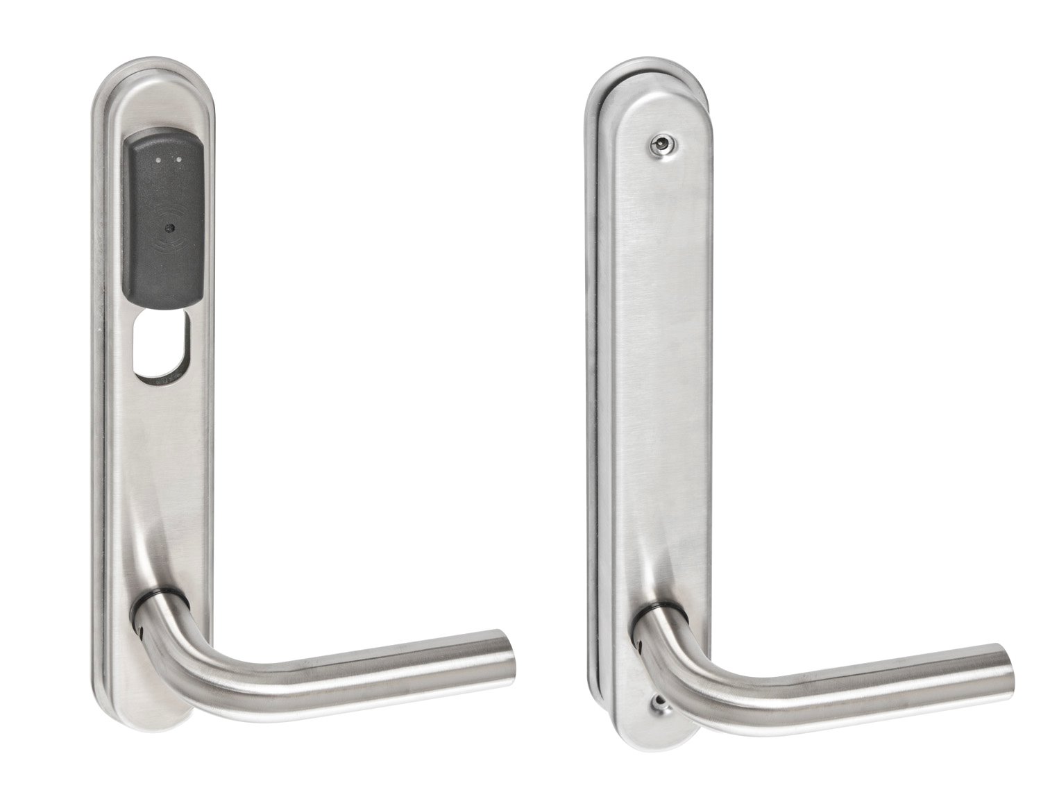 Dörrmonterad batteridriven läsare monterad på en plåt för Skandinaviska låshus vilket innebär att du inte behöver göra några borrhål i dörren. Den är tillverkad i rostfritt stål och drivs av 3 st AAA batterier som klarar upp till 20 000 öppningar. Ingen extern strömförsörjning krävs i dörr eller karm.