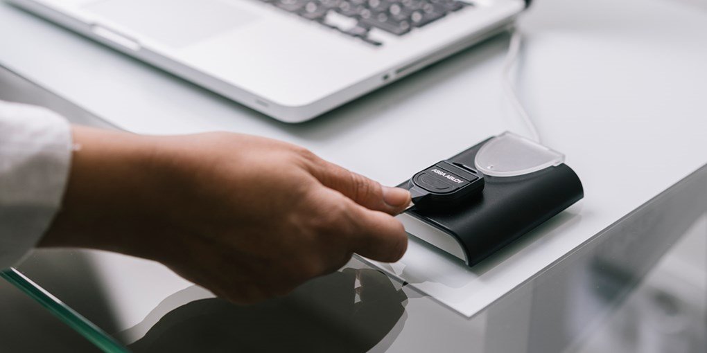 PULSE-nyckeln har patenterad dubbel behörighetsteknologi. Den fungerar som en digital nyckel i låscylindrar och fungerar också som en passertag presenteras för en läsare i ett passersystem.
