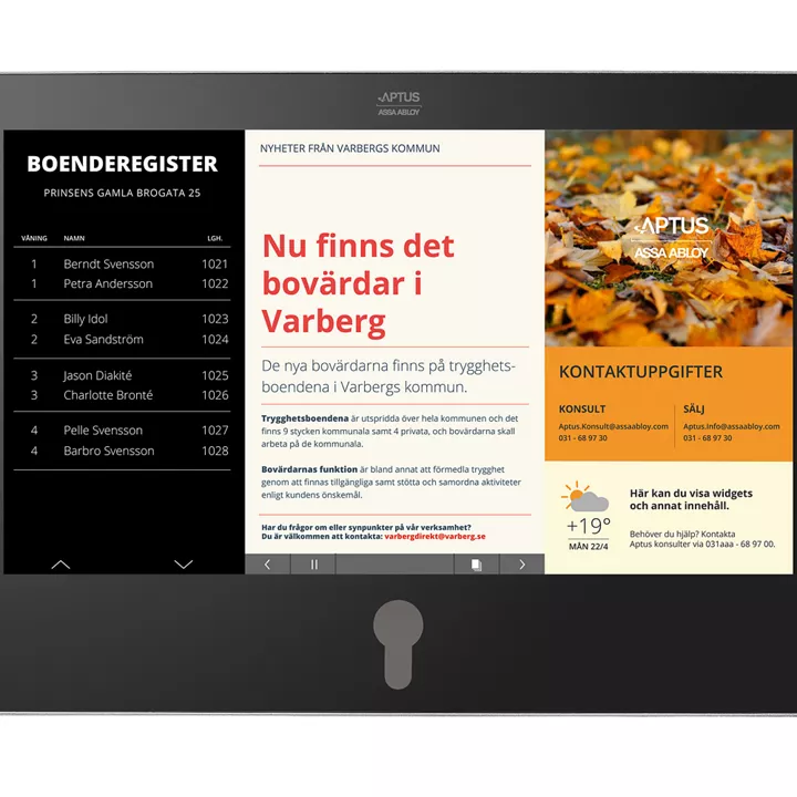 Färgpekskärm med flexibelt gränssnitt. Den är användarvänlig och smidig att installera. Skärmen startar automatiskt när någon passerar. Vill du ha hjälp med installation eller teknisk information kontakta våra tekniska konsulter via Aptus.Konsult@assaabloy.com eller på telefonnummer 031-68 97 10. Övriga frågor hänvisas till vår supportavdelning.