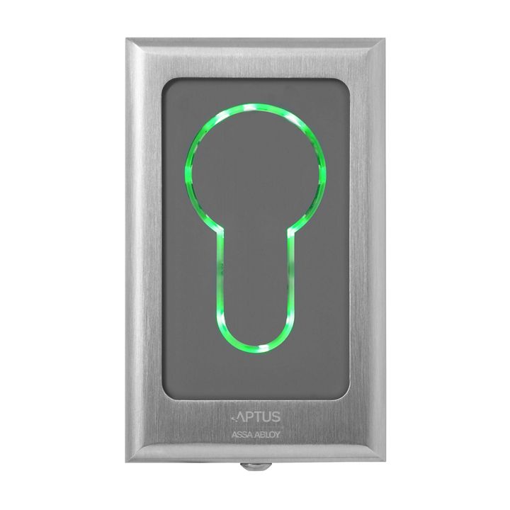 En liten och sober läsare som har belyst nyckelhålssymbol. Kan beställas med inverterad logotyp. Öppna 2100 monteras utanpåliggande för inom- och utomhusbruk.
