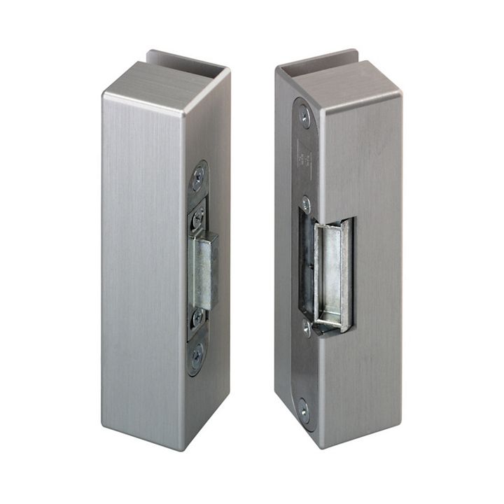 Thanks to its compact design and problem-free installation, the electric strike is particularly suited for all-glass doors with overhead lighting or glass side sections. No complicated tools for installation – simply stick in place (the special adhesive is included with every electric strike). The aluminum masonry box can be used for two electric strike versions: fail-locked and fail-unlocked. Modern, neutral design of the electric strike fitting. This consists of an electric strike section and a counterpart with identical dimensions.